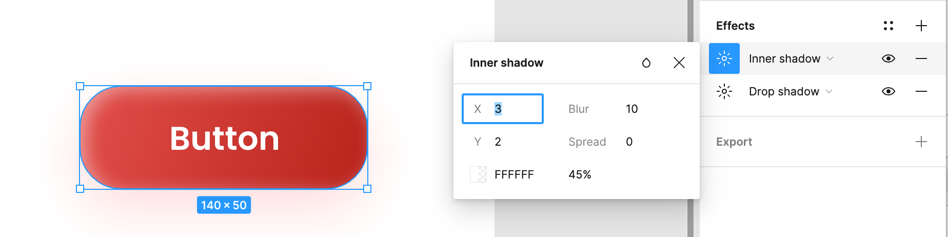 나는 X축에는 3, Y축에는 2의 값을 주었다. 그림자 색상은 #FFFFFF(흰색)으로 설정하고 투명도는 45%로 조절했다. 개인적으로는 50% 전후를 추천하지만 당연히 만드는 사람의 취향과 컨셉에 맞게 조정이 가능하다. 숫자가 높아질수록 버튼에 입체감이 생긴다.