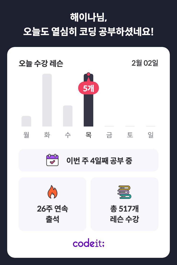 오늘도 어김없이 코드잇 공부~ 출근길을 이용해서 빠르게 강의 5개를 들었다. 코드잇 강의는 길지 않아서 출퇴근길, 점심시간 등 여유시간이 생겼을 때에 부담없이 들을 수 있다.