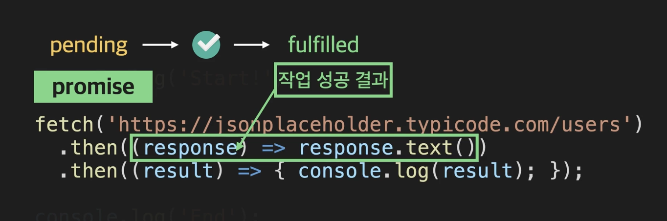 위와 같은 코드에서 작업을 성공(fulfilled 상태가 됨)한다면 promise 객체는 response를 작업 성공 결과로 갖는다.