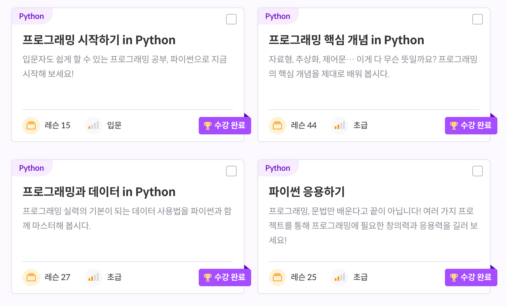 프로그래밍 기초부터 파이썬, 자바스크립트, 웹퍼블리싱 등 다양한 분야의 강의가 준비되어 있고, 최근에는 UI 디자인 기초(피그마) 강의도 생겼다. 피그마의 경우, 아직은 기초 부분만 다루고 있어 디자이너에게 추천하기에는 어렵고... 좀 더 기다리면 다음 커리큘럼이 업데이트 될것으로 기대한다.