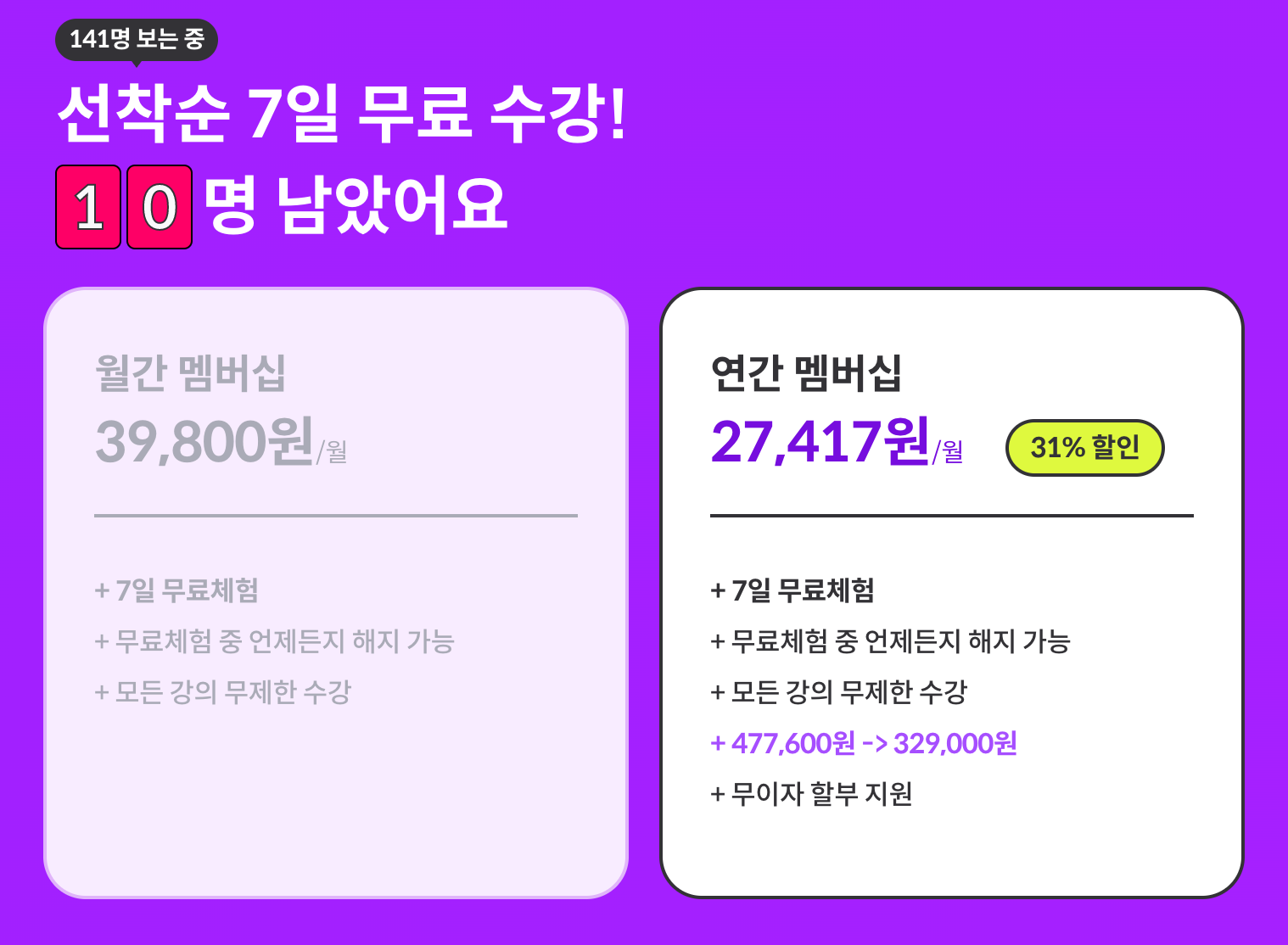 나는 개발에 관심이 많은 디자이너라 코딩 온라인 강의를 많이 들었는데, 아직까지 수강했던 사이트들 중에서 코드잇 멤버쉽이 가장 만족스럽다. 2023년 2월 기준, 연간 멤버쉽 27,417원으로 모든 강의를 무제한 수강할 수 있으며, 7일동안 무료 체험도 가능하다.