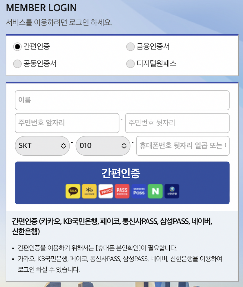 그 다음 휴대폰 번호를 입력한 후에 간편인증을 진행한다. 나는 가장 많이 사용하는 카카오톡을 이용해서 실명인증을 했다.