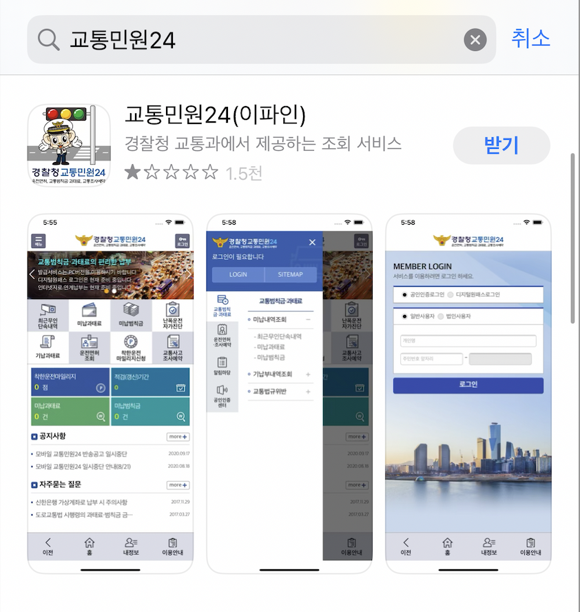 앱스토어에 들어가서 교통민원24라고 검색하면 '교통민원24(이파인)' 이라는 검색결과를 확인할 수 있을 것이다. 다운로드 한 뒤에 실행한다.