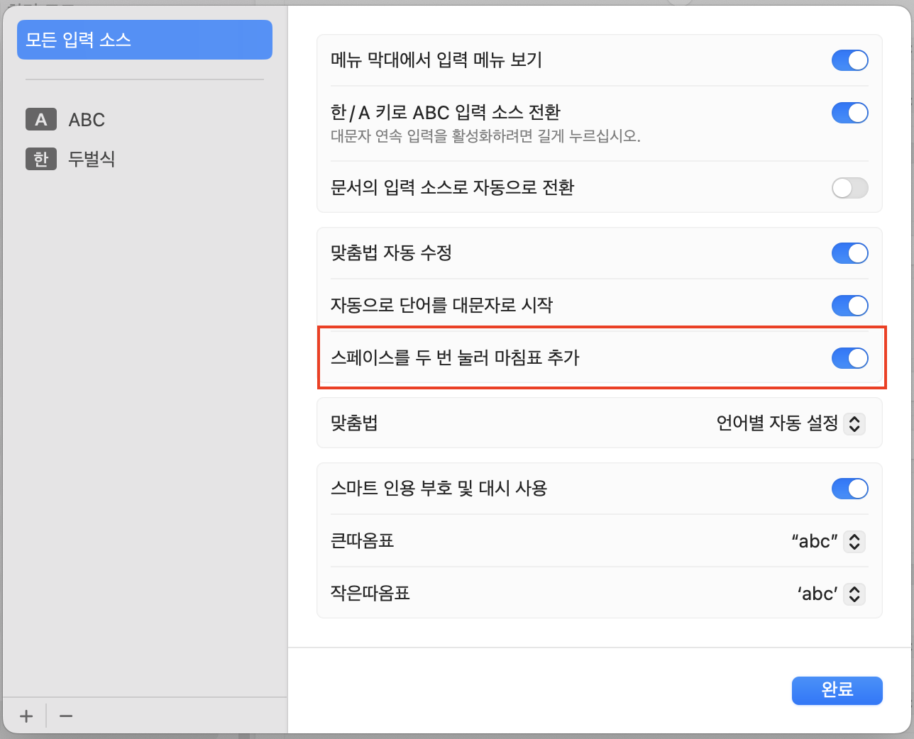 맥북에서 스페이스 바 두 번 눌렀을 때 마침표 나오는 현상 해결방법