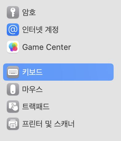 시스템 설정을 실행하면 좌측에 항목들이 쭉 나오는데 그 중에서 '키보드'를 선택한다.