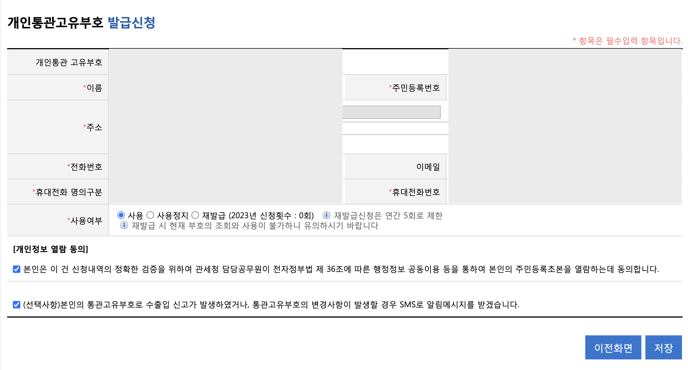 나는 카톡을 이용해서 본인 인증을 진행했다. 인증을 마치면 발급신청 및 조회 화면이 나온다. 개인통관고유부호와 함께 이름, 주민등록번호, 주소, 전화번호, 이메일, 휴대전화번호 등을 확인할 수 있다. 이거 도대체 언제 발급했던 건지... 이름, 주민등록번호를 제외한 모든 것이 예전 정보로 되어 있었다.
