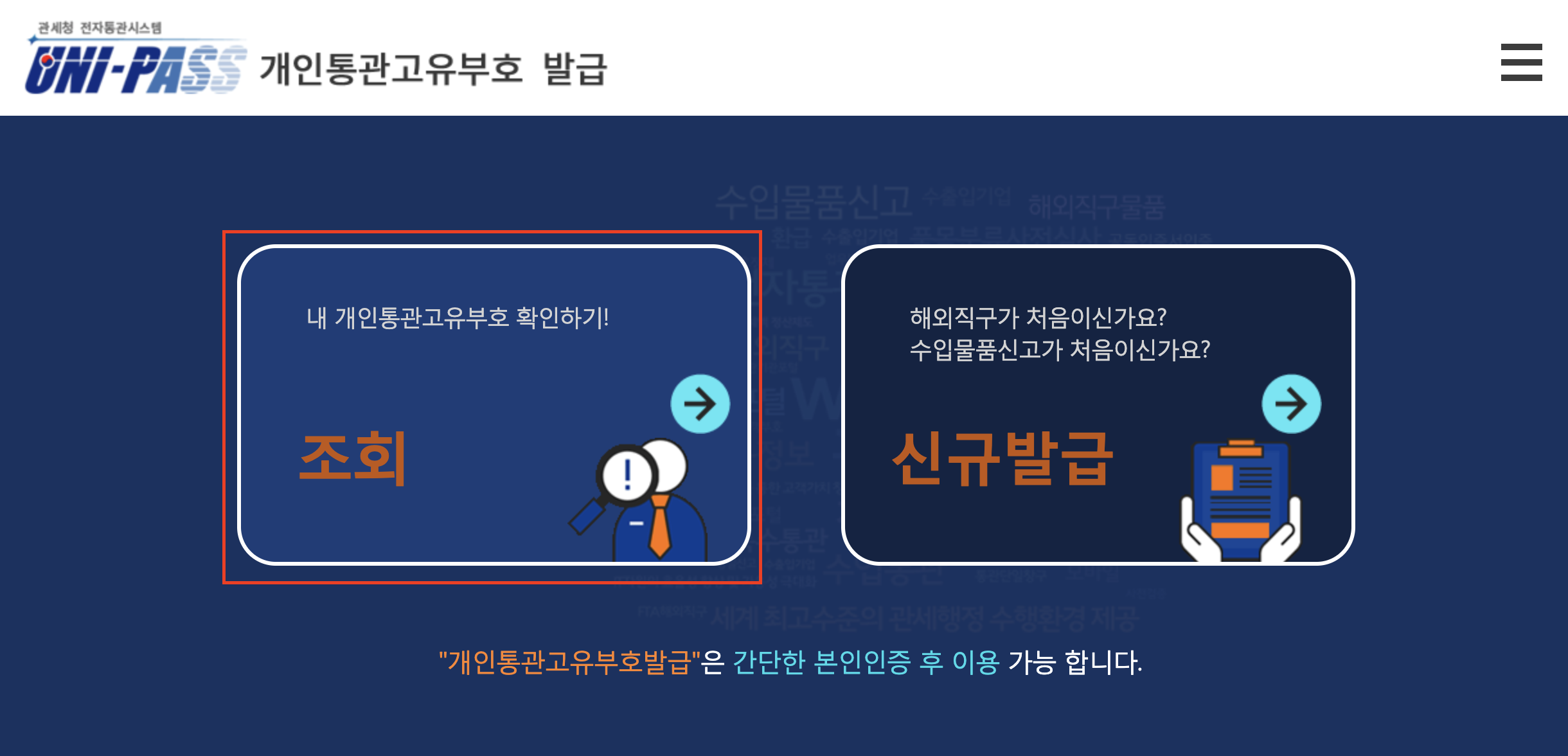 홈페이지 첫 화면에 있는 조회(내 개인통관고유부호 확인하기!) 버튼을 클릭한다.
