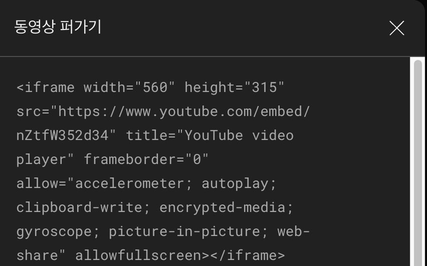 유튜브에서 공유하기(동영상 퍼가기) 기능을 이용할 때 iframe 으로 시작하는 태그를 확인할 수 있다.