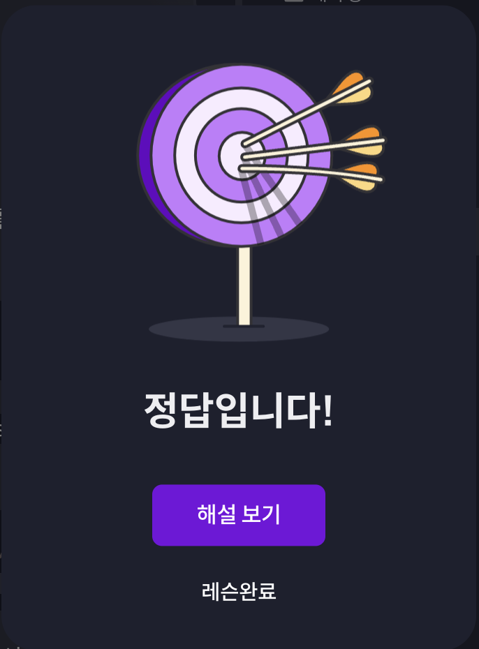 강의를 듣고 나서 이어지는 커리큘럼으로 실습을 해 보았다. 셀프 채점을 하고 나면 "정답입니다!" 하는 팝업이 뜨는데, 강의 내용을 제대로 이해했다는 생각이 들어 기분이 좋다. 왠지... 학교 다닐 때 선생님한테 칭찬 받은 기분?ㅋㅋㅋ