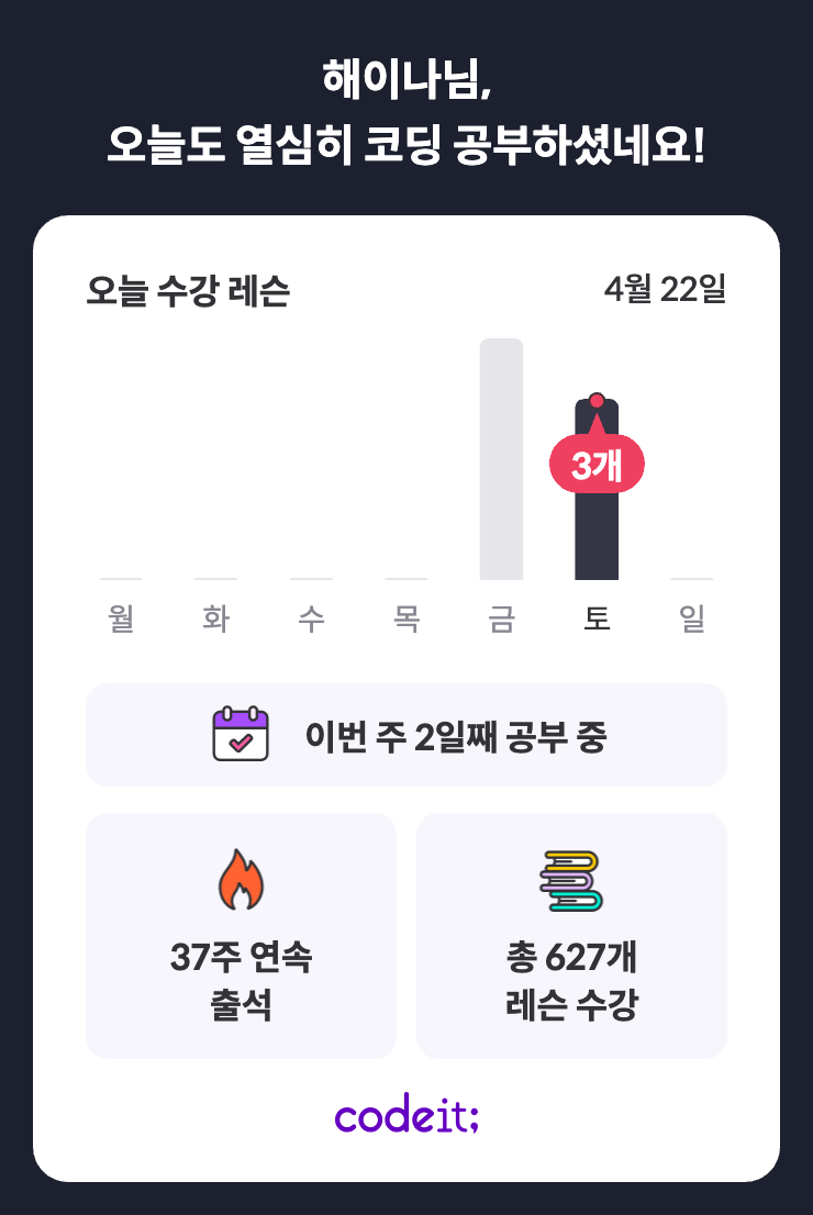 코드잇 오늘 공부 인증을 끝으로 이번 주 코딩공부 끝! 담주에는 정신차리고 빠릿빠릿하게 강의를 들어야겠다.