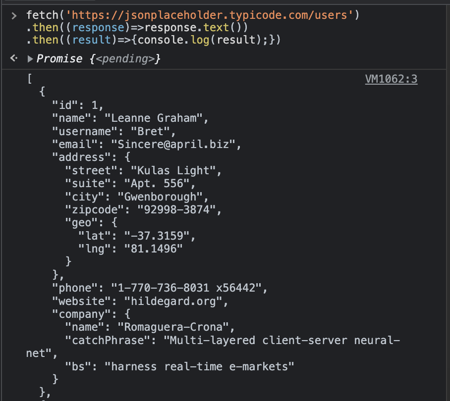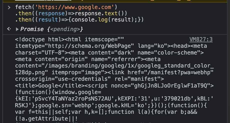 이렇게 request로 받을 수 있는 포멧은 html과 javascript 코드 외에도 여러가지가 있다. 개발자 도구 console 창에 아래와 같이 입력해서 실행하면, html 형식이 아니라 데이터로 추정되는 결과를 response로 받는다. 이것은 JSON 이라고 하는 포맷인데, JavaScript Object Notation의 약자이다. 개발자들이 어떤 정보를 나타낼 때 보통 JSON이라고 하는 데이터 포맷을 사용한다.