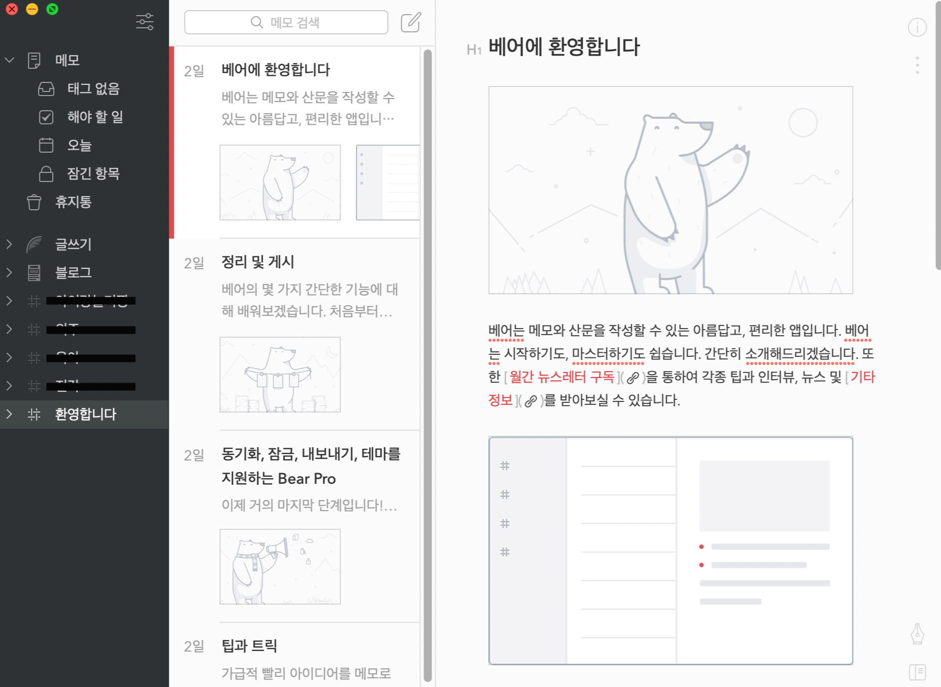 요즘 필기앱/노트앱을 비교해보고 있는 중이라... 구글에서 검색하면 많이 언급되던 앱 중의 하나인 베어(Bear)를 설치해 보았다. 나는 보통 스케쥴 및 각종 정보들을 노션(Notion)에서 정리하고 관리하는데, 스스로 이 앱의 용도를 업무용(?)으로 정했기 때문인지 일상의 에피소드 혹은 아무렇게나 떠오르는 생각들을 기록하는데에는 왠지 모를 거부감이 있었다. 그래서 글쓰기에 집중할 수 있는 앱을 찾고 있었는데, 베어가 메모 기능에 중점을 두었다고 하여 기대가 되었다.