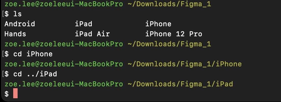 위의 이미지는 Figma_1 폴더 안의 iPhone 으로 이동했다가 다시 상대 경로를 이용해서 iPad 로 이동한 예제이다.