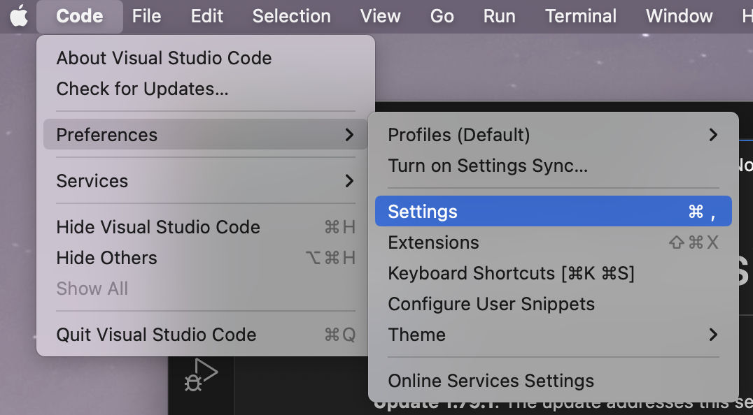 먼저 vs 코드의 설정 메뉴에 들어간다. 들어가는 방법은 여러가지가 있는데, 아래 둘 중에 더 편한 방법을 선택하면 될 듯 하다.