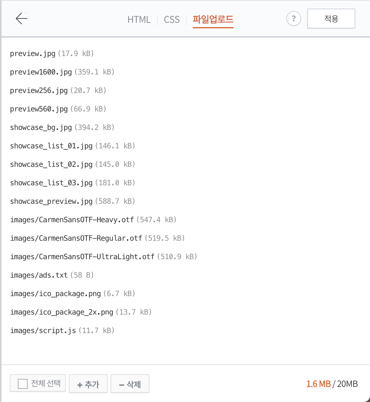 그 다음 나오는 화면에서 파일업로드 탭을 선택한 후, 하단의 '추가' 버튼을 클릭해서 적용하고 싶은 폰트를 업로드한다. 당연하겠지만 업로드를 위해서는 폰트 파일이 PC 안에 다운로드된 상태여야 한다. (폰트 파일 미리 준비할 것) 나는 미리 라이센스를 구매한 Carmen Sans OTF 파일을 업로드했다.