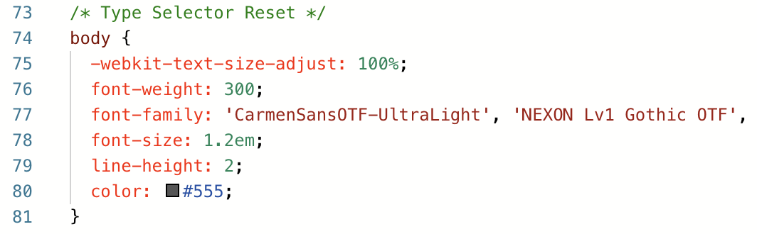 스크롤을 내려 /* Type Selector Reset */ 부분을 찾는다. 만약 해당 부분을 찾는 것이 어렵다면 단축키 command + F를 이용하면 도움이 될 것이다. (윈도우는 ctrl + F) 그 다음 body 옆의 대괄호{ } 안에서 font-family를 찾아 새롭게 업로드한 폰트명으로 바꾸어주면 된다.