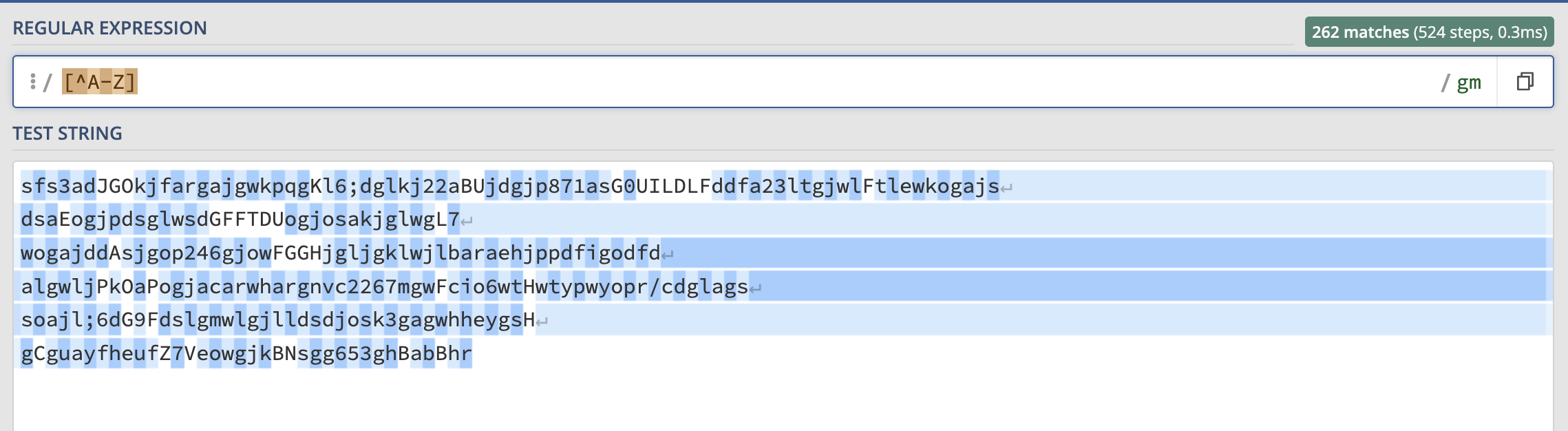 ex) 영어 대문자를 모두 제외한 나머지를 선택하고 싶다면 [^A-Z]