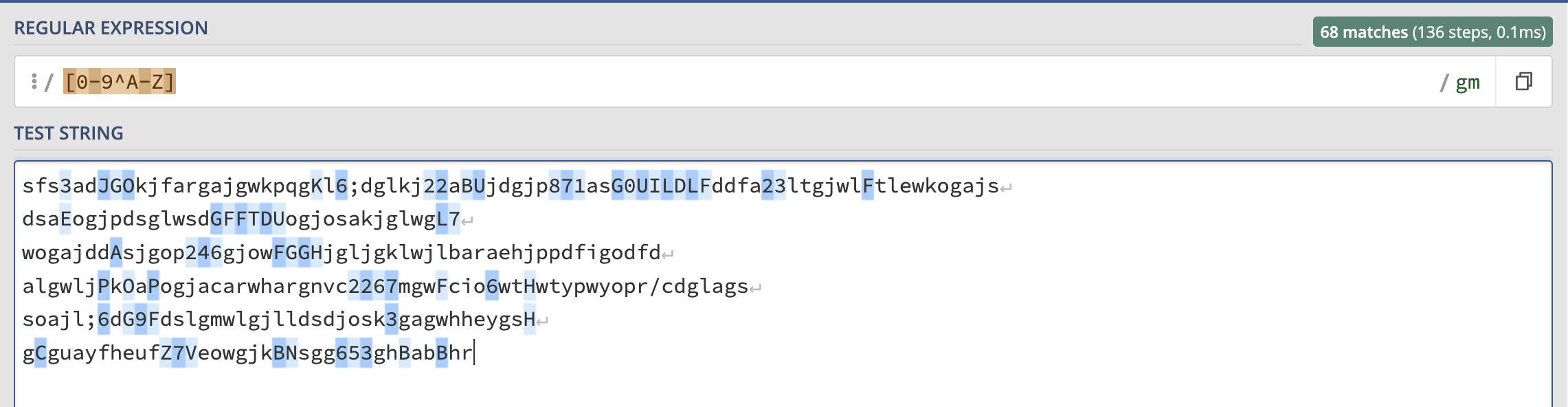 중요한 것은 제외의 의미로 ^를 사용할 때에 집합 가장 처음에 위치해야 한다. 영어 대문자를 제외하고 싶어서 [0-9^A-Z]와 같이 표현식을 쓴다면, 숫자와 ^라는 문자, 영어 대문자를 모두 선택하라는 의미로 받아들인다.