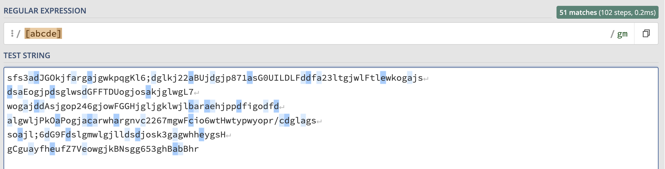 ex) 소문자 알파벳 a, b, c, d, e를 찾고 싶다면 [abcde]