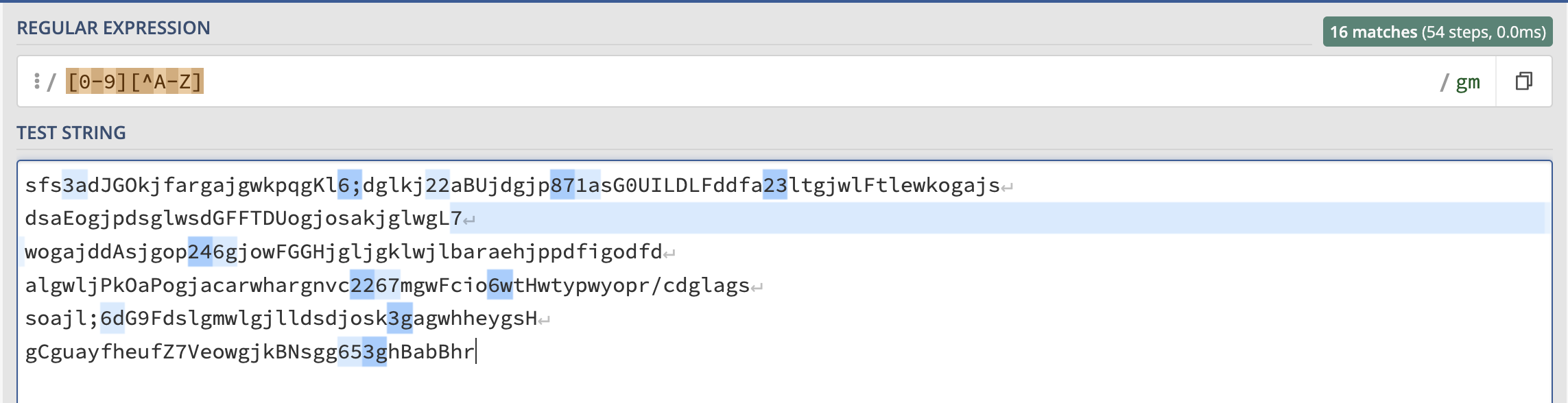 의도대로 선택하기 위해서는 집합을 나누어 [0-9][^A-Z]라고 입력해야 한다.