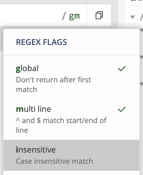 만약 대소문자 구분없이 찾고 싶다면 플래그 설정을 하면 된다. 아래와 같이 Gegular Expression 창 우측의 gm 이라고 되어 있는 부분을 클릭하여 insensitive를 선택한다.