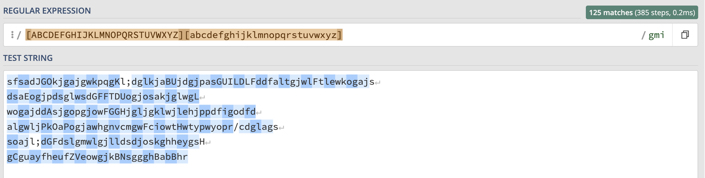 알파벳의 경우 [ABCDEFGHIJKLMNOPQRSTUVWXYZ][abcdefghijklmnopqrstuvwxyz]와 같이 대문자 집합, 소문자 집합을 연결한 정규 표현식을 사용하면 본문에서 대문자+소문자 붙어있는 부분만 선택된다.