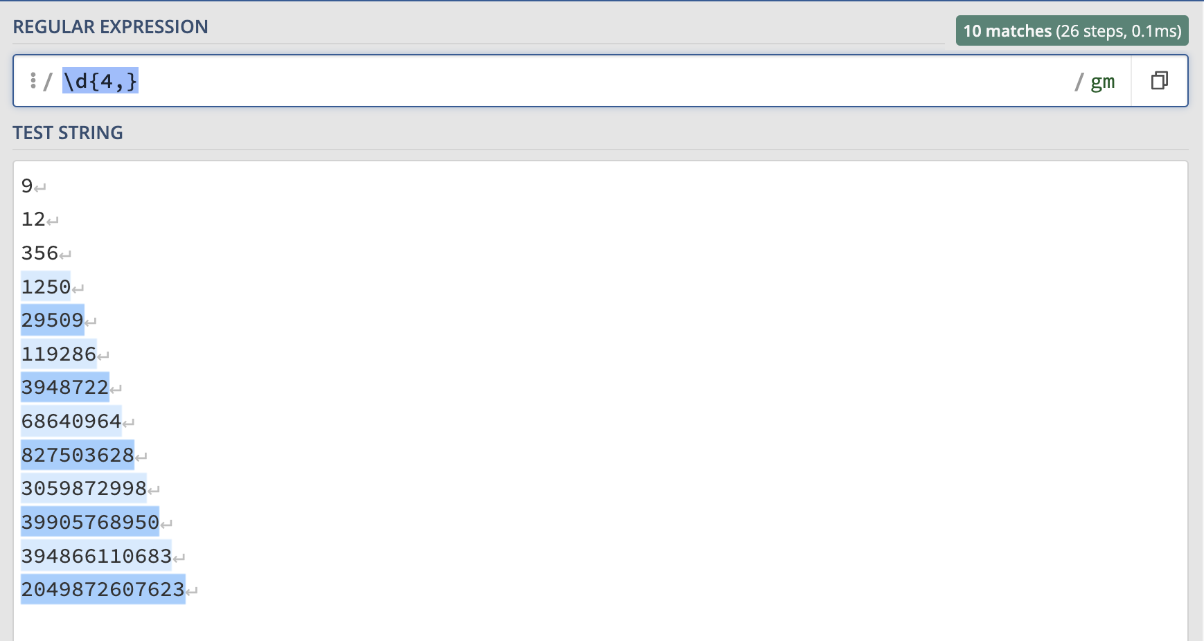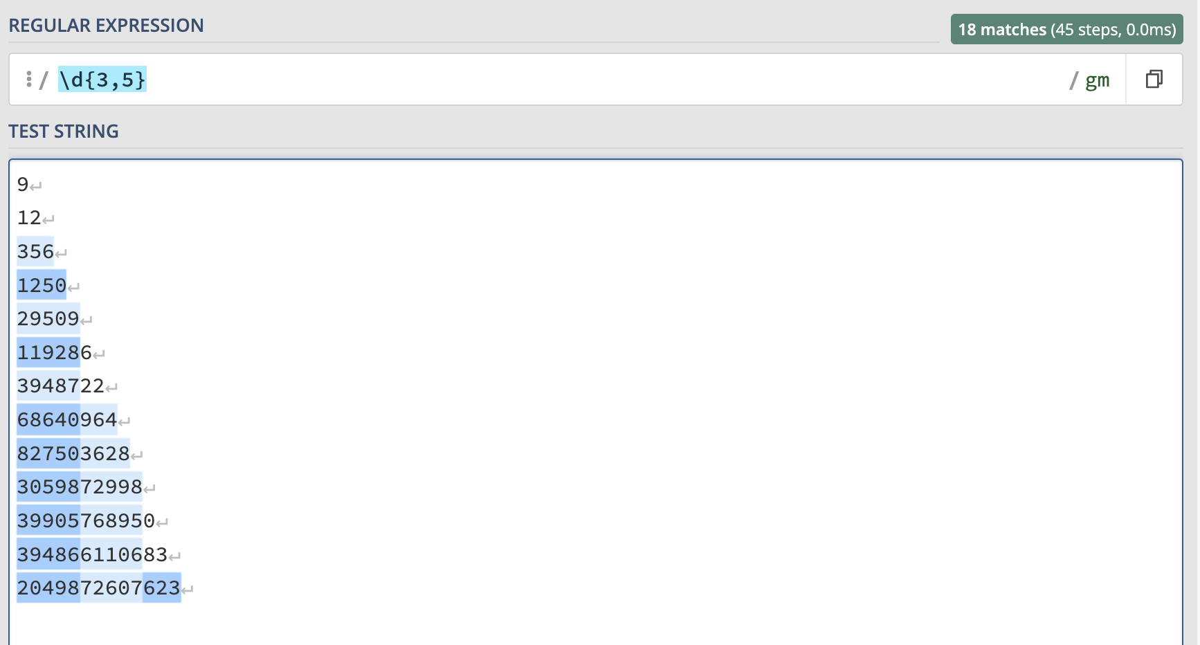 다섯 자리 숫자를 선택하고 난 후에 이어지는 숫자가 세 자리 이상이면, 해당 부분도 선택된다는 점을 알아두면 좋을 것 같다. (기준 충족)