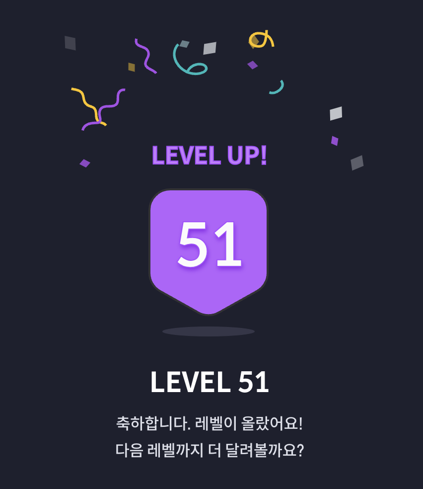 나는 코드잇이라는 사이트에서 강의를 들으며 코딩 공부를 하고 있는데 (여기서 공부한 내용을 정리해서 포스팅 하는 것) 강의를 듣다보니 어느 새 경험치가 쌓여서 51레벨이 되었다. 항상 레벨업 하는 순간을 캡처하고 싶었는데 빠르게 휘리릭 지나가서 쳐다만 보다가... 오늘은 리뉴얼이 되었는지 레벨업 화면이 사라지지 않아서 얼른 캡처를 했다ㅋㅋㅋ