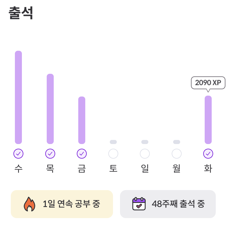 그리고 코드잇에 로그인을 하면 강의를 들은 날에 출석 표시를 해 주는데, 나는 48주째 연속 출석중이다. 52주 연속 출석 배지를 받는 것을 목표로 열심히 강의를 듣고 있다.
