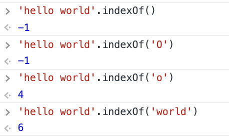 .IndexOf() : 주어진 값과 일치하는 첫번째 인덱스를 반환 / 일치하는 값이 없으면 -1 반환 / 대소문자를 구분함 / 아래 이미지에서 ('world')에 6이 출력된 것은 '여섯번째 시작되는 문자열에서 world가 시작된다'는 의미