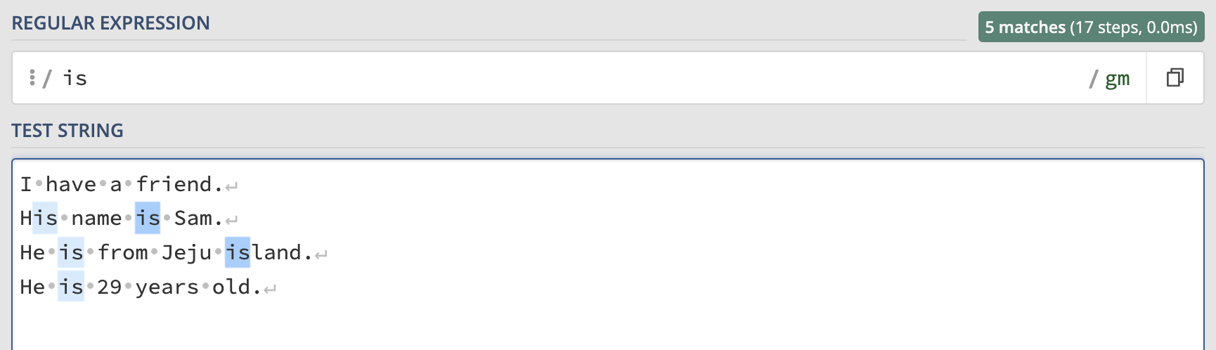 아래와 같은 문장이 있고 is를 입력하면 알파벳 is가 사용된 부분이 모두 선택된다.