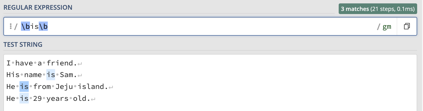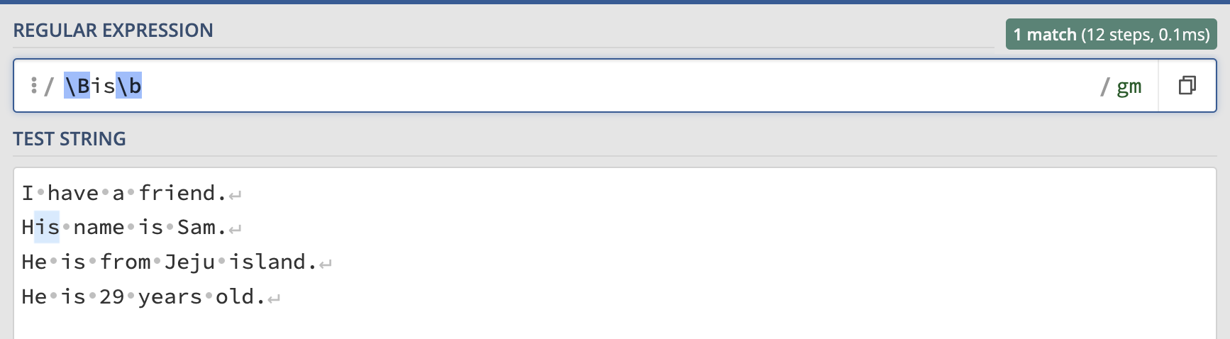 이 때 띄어쓰기 조건을 추가로 사용하고 싶다면 \b, \B를 사용하면 된다.