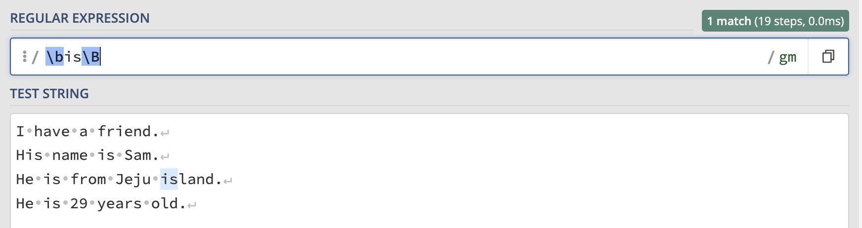 이 때 띄어쓰기 조건을 추가로 사용하고 싶다면 \b, \B를 사용하면 된다.