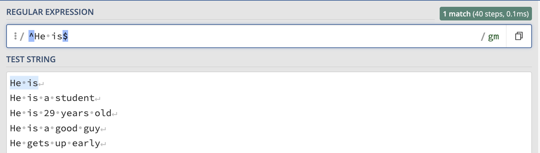 추가로 알아두어야 할 점은 플래그 옵션 중에서 m의 추가 여부에 따라 결과값이 달라진다는 것이다. 플래그 옵션 m을 사용하면 줄바꿈이 된 지점 또한 문장의 경계로 인식한다. m을 사용하지 않으면 줄바꿈을 문장의 경계로 인식하지 않는다.