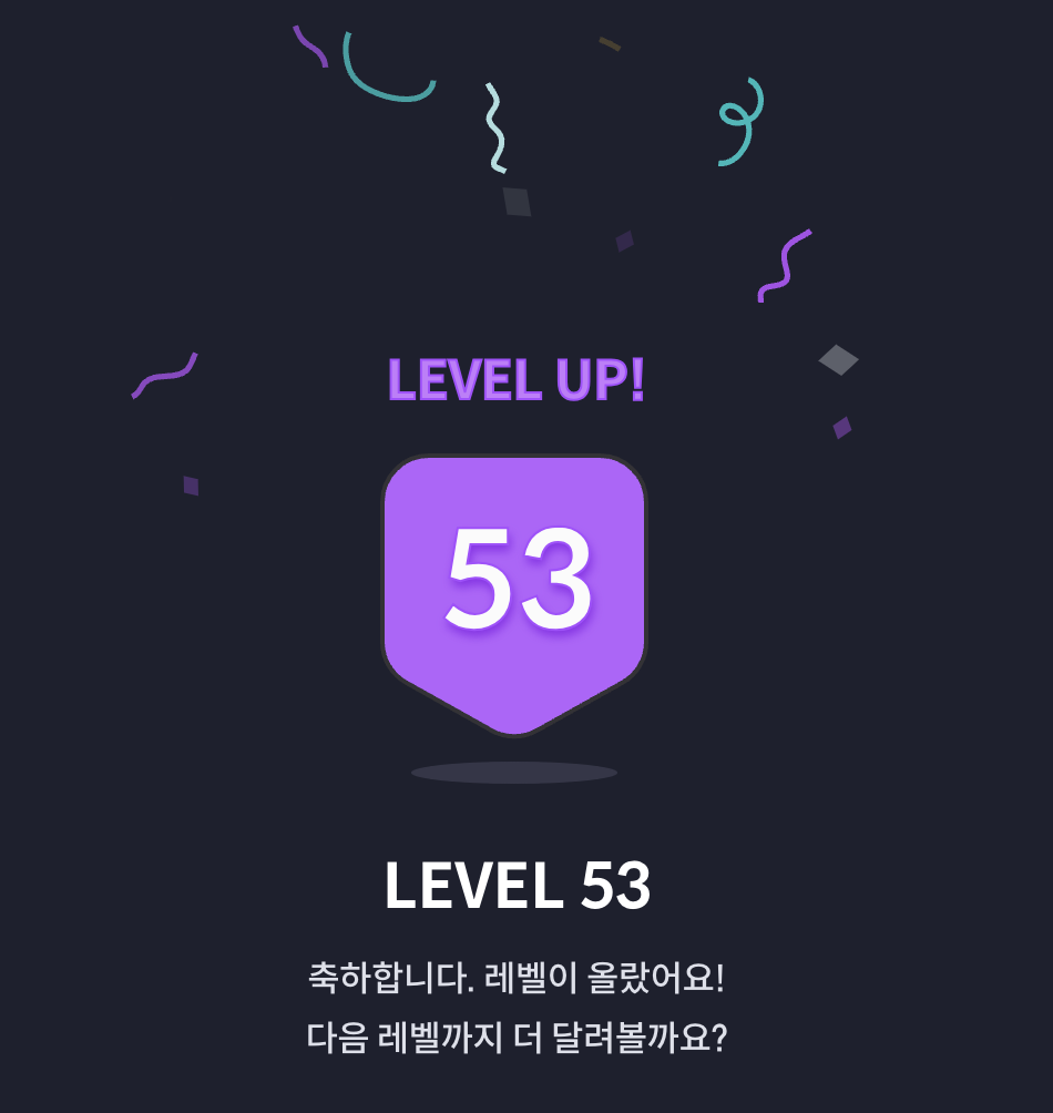 강의를 열심히 들어서 오늘 드디어 코드잇 53 레벨이 되었다. 그리고 51주째 출석 중... 다음 주까지만 출석을 하면 내가 갖고 싶어하던 52주 연속 출석 뱃지를 받을 수 있다. (오호호호... 뱃지 받으면 또 자랑해야지)