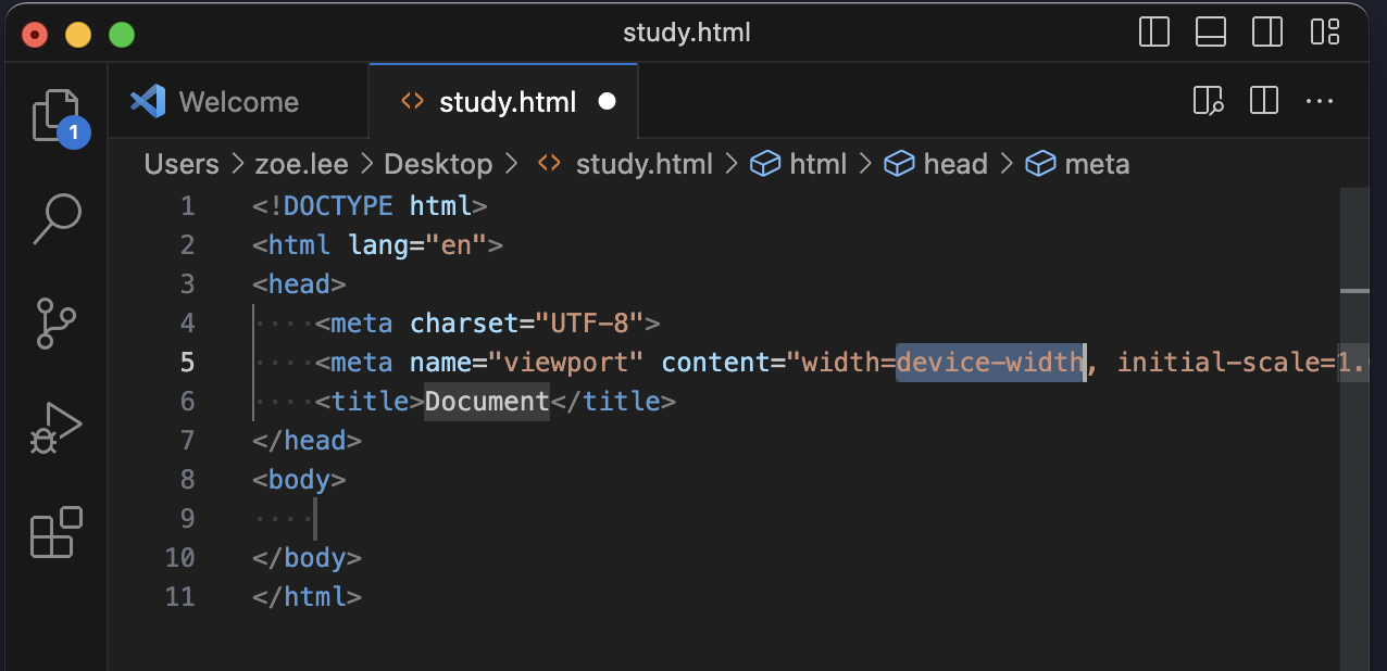 오늘 코드잇 강의를 듣다가 (나에게는) 대단한 꿀팁 하나를 알게되어 블로그에도 공유하려고 한다. html 파일의 구조를 보면 <html>,<head>, <title>, <body> 등의 태그를 순서대로 쓰는데, 이런 필수 코드들을 한 번에 자동으로 입력할 수 있는 방법이다.