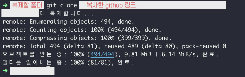 PC로 돌아가서 원하는 위치에 저장소를 복제할 폴더를 하나 생성한다. 폴더 이름은 아무거나 해도 무방하지만, 나는 보통 알아보기 쉽도록 프로젝트명으로 통일해주고 있다. 폴더를 만든 뒤에 터미널을 열고 해당 폴더로 이동한다. 그 후 아래와 같이 명령어를 입력하고 엔터를 치면 자동으로 저장소가 복제된다.