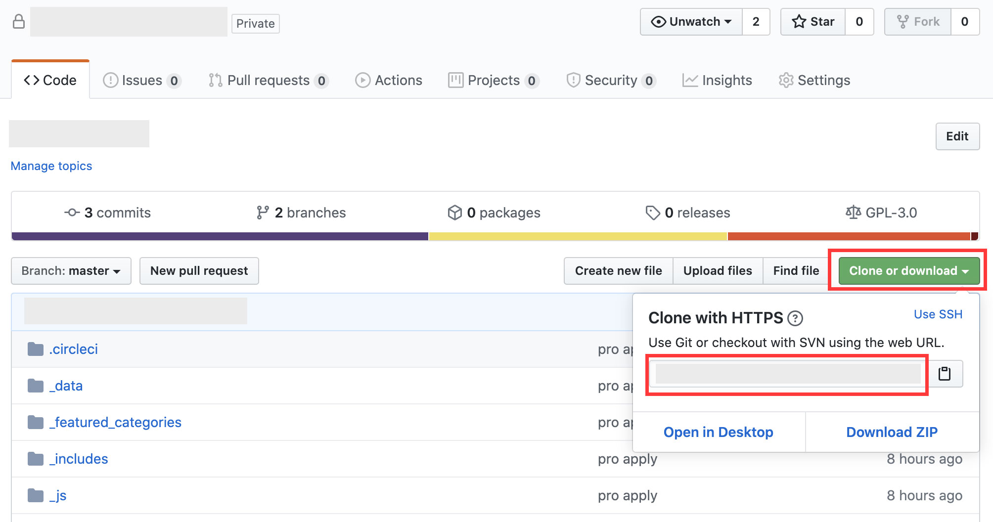 먼저 깃허브 사이트의 해당 저장소 페이지에 들어간다. 우측에 Clone or download 라고 쓰여있는 초록색 버튼을 클릭하면 아래와 같은 창이 뜬다. Clone with HTTPS 중간 부분의 링크를 복사하면 사이트에서 할 일은 끝!