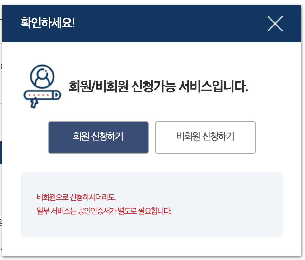 3. 회원 or 비회원 여부를 선택한다. (본인은 비회원을 선택함) 공인인증서 로그인이 필요하다.