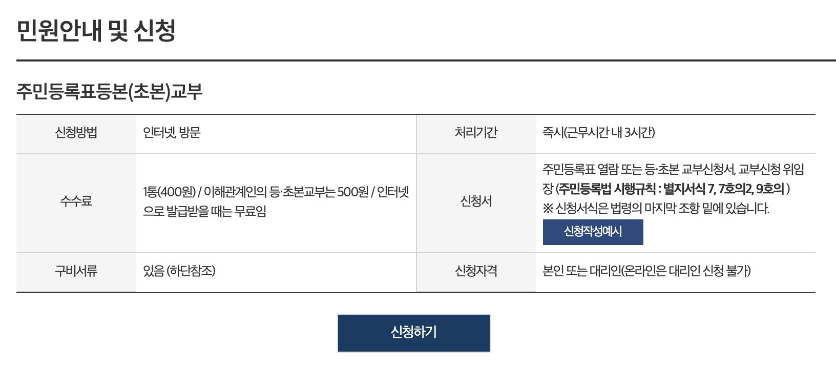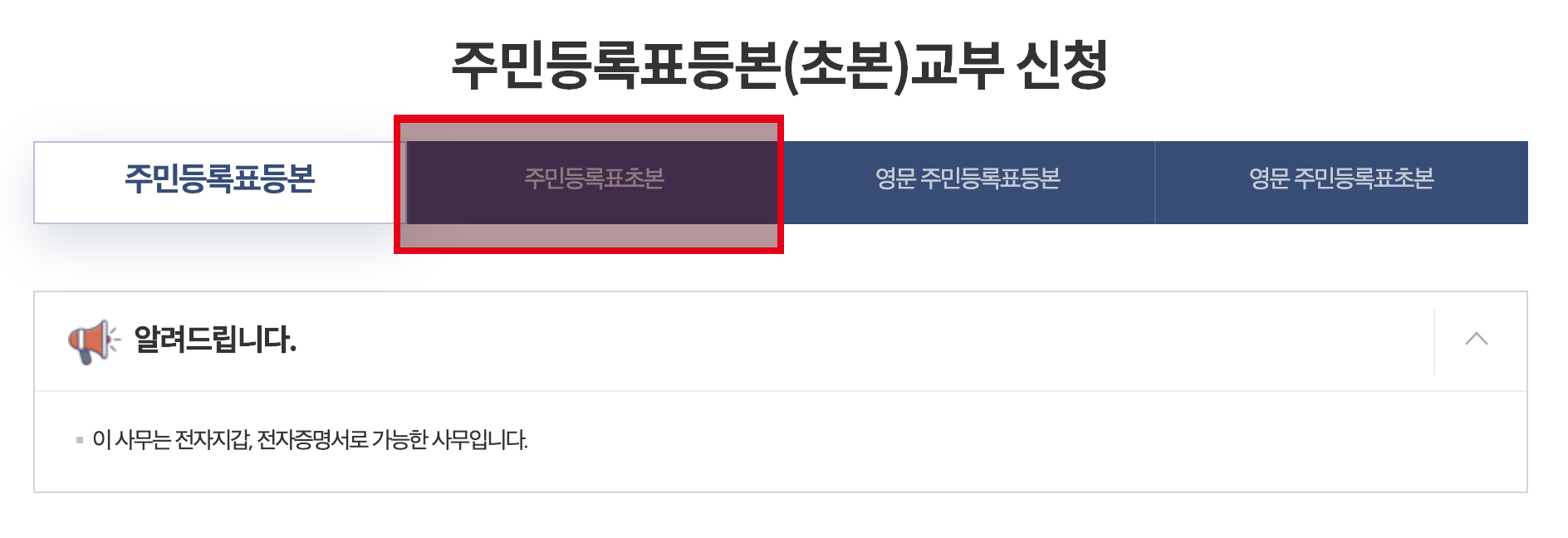 4. 공인인증서 로그인을 하면 자동으로 신청하는 화면으로 이동한다. 본인이 발급받으려는 서류를 잘 확인하고 탭을 선택하자. 나는 한글 주민등록표초본이 필요하여 해당 탭을 클릭했다.