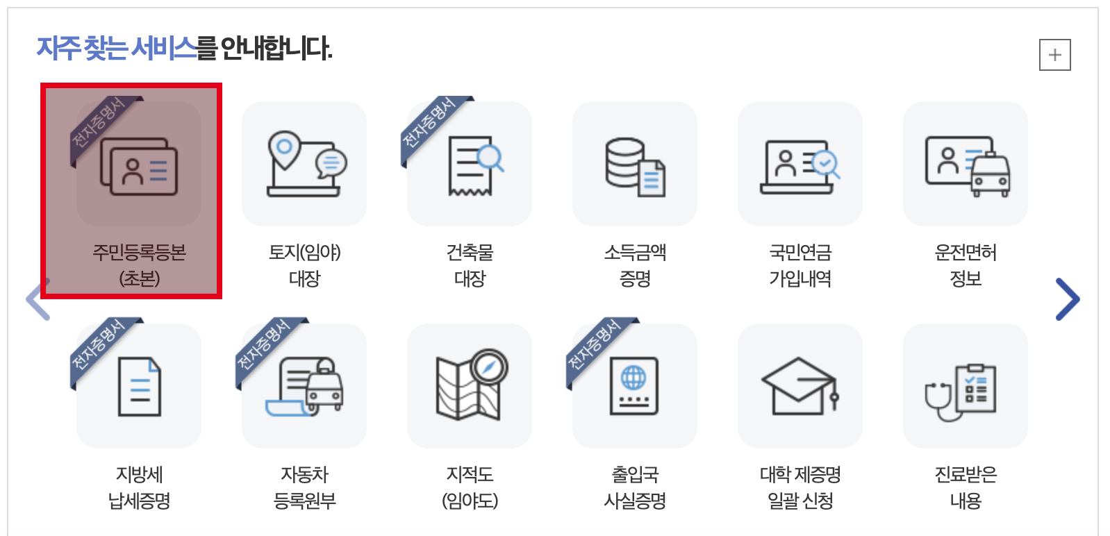1. 정부24 홈페이지에 방문하여, 사이트 중간 부분의 자주 찾는 서비스 > 주민등록등본(초본) 아이콘을 클릭한다.