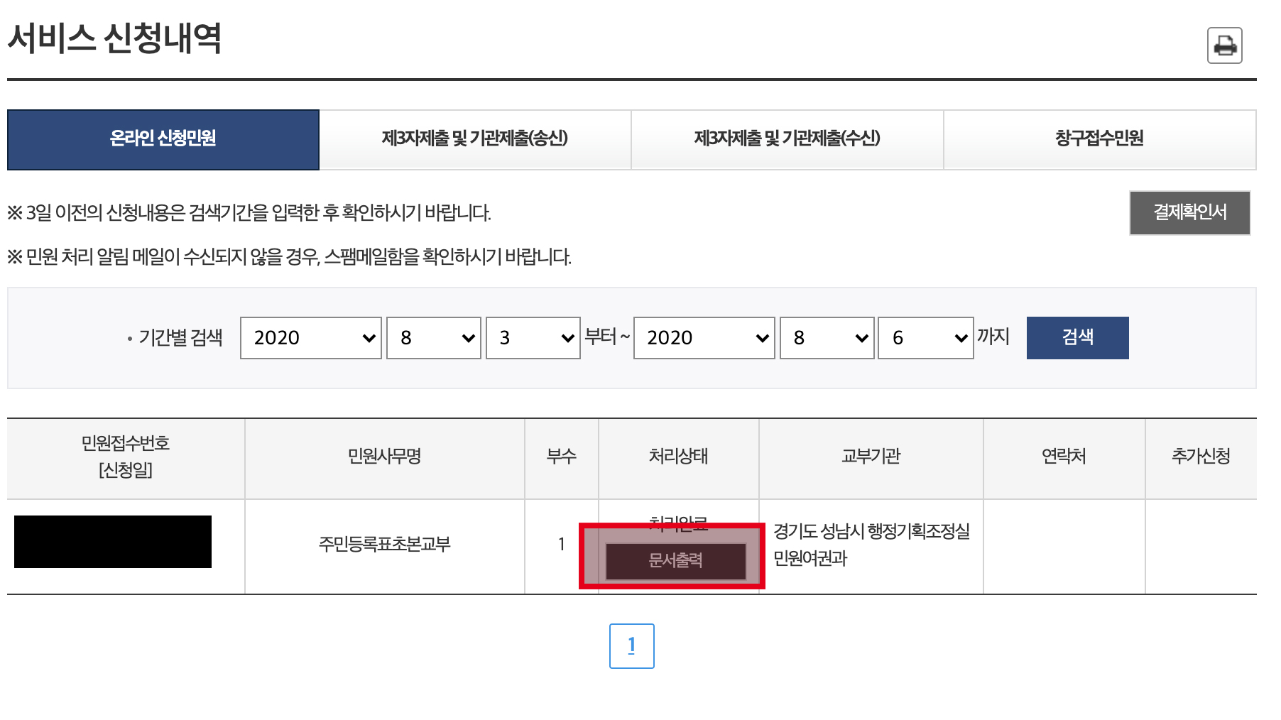 6. 처리상태 부분이 '처리완료'라면 '문서출력' 버튼을 클릭하여 해당 문서를 인쇄할 수 있다.