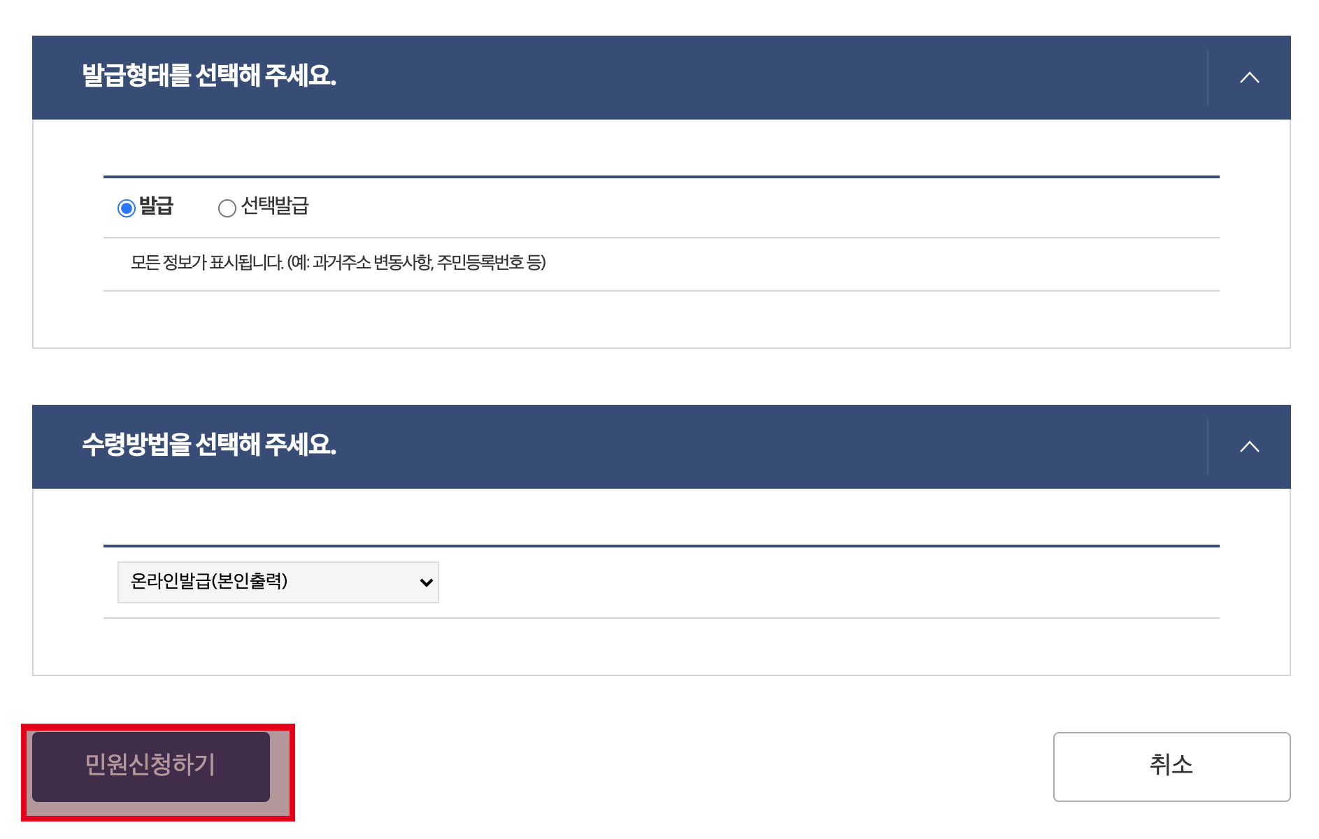 5. 각종 발급옵션을 선택한 후에 하단 '민원신청하기' 버튼을 클릭한다.