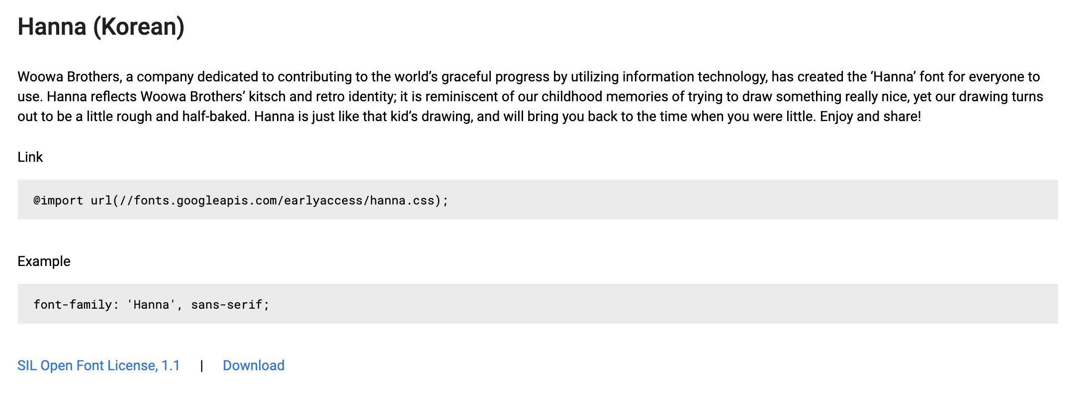 구글 폰트 (아래 링크) 페이지에 들어가서 link 항목을 복사하여 웹 폰트를 적용할 수 있다.