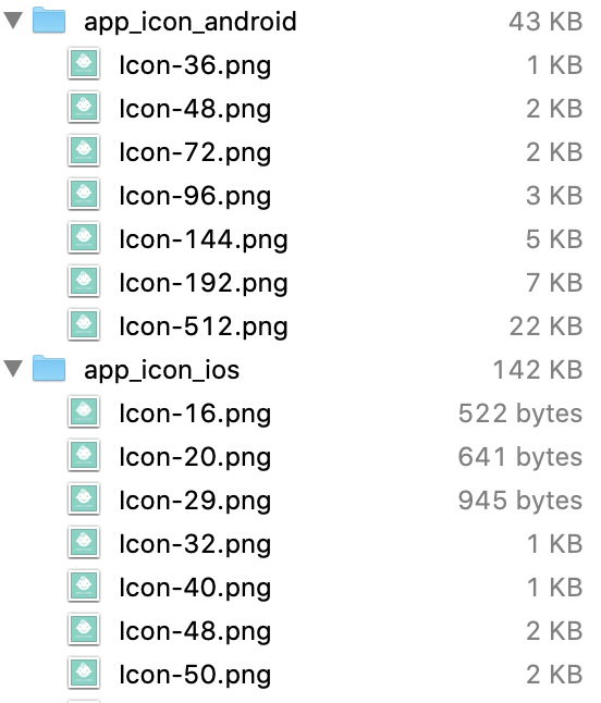 압축파일을 풀었더니 이렇게 필요한 아이콘 사이즈로 변환된 이미지들이 정리되어 들어 있었다. 앱 아이콘 메이커 만세!