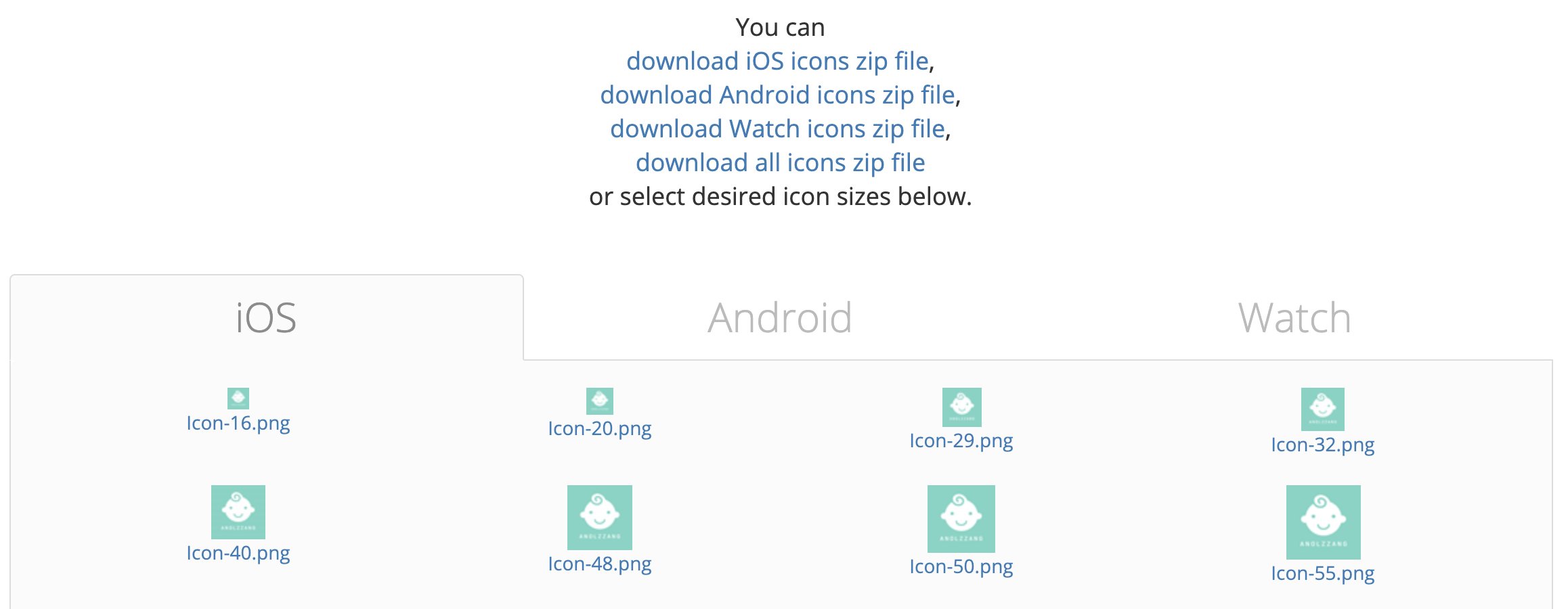 아래에서 앱 아이콘 사이즈가 변경된 것을 확인할 수 있다. ios / android / watch / all 중에서 필요한 파일을 선택하여 다운로드 한다. 나는 ios와 안드로이드 아이콘 파일이 필요하여 두 개의 압축파일을 받았다.