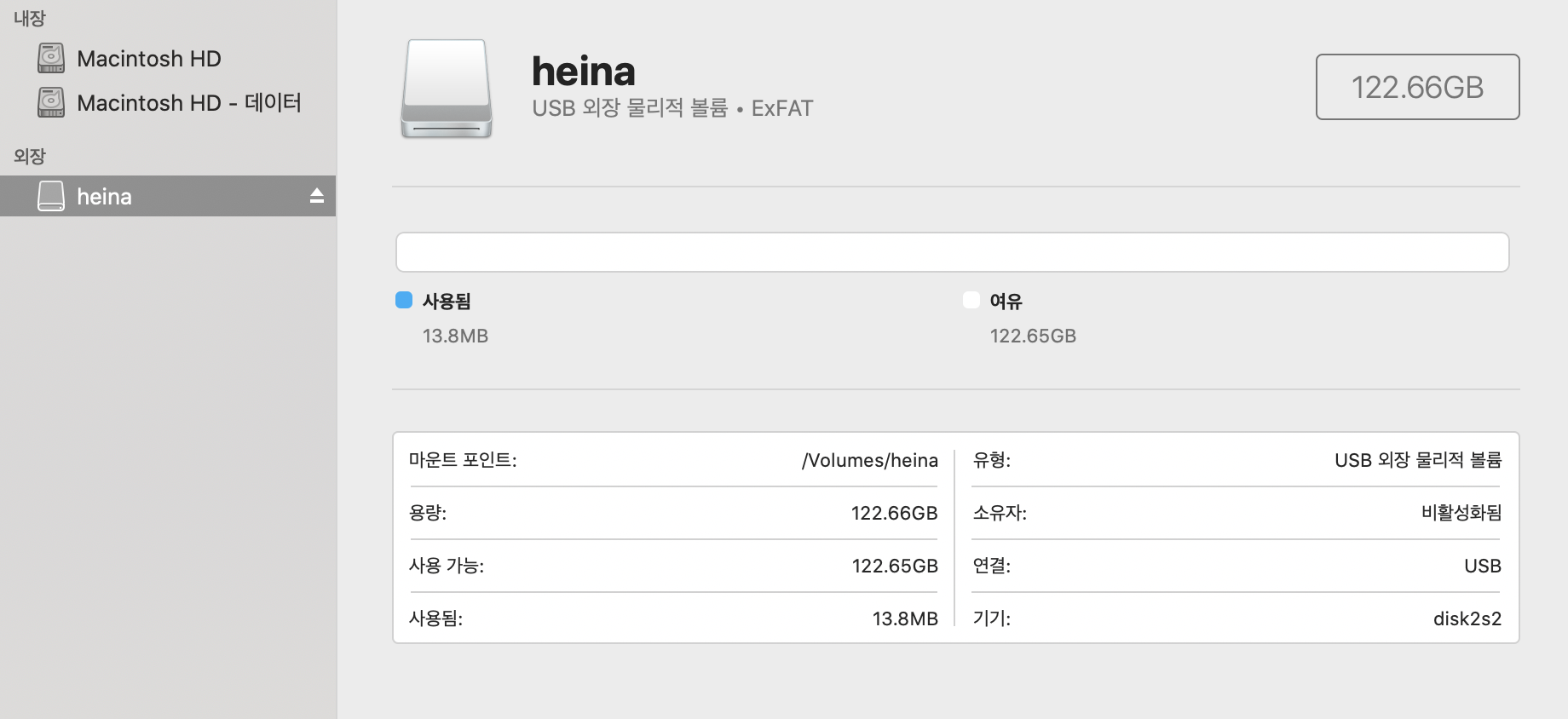 USB 이름이 내가 입력한 heina로 바뀌었고, 말끔하게 포맷된 것을 확인할 수 있다.