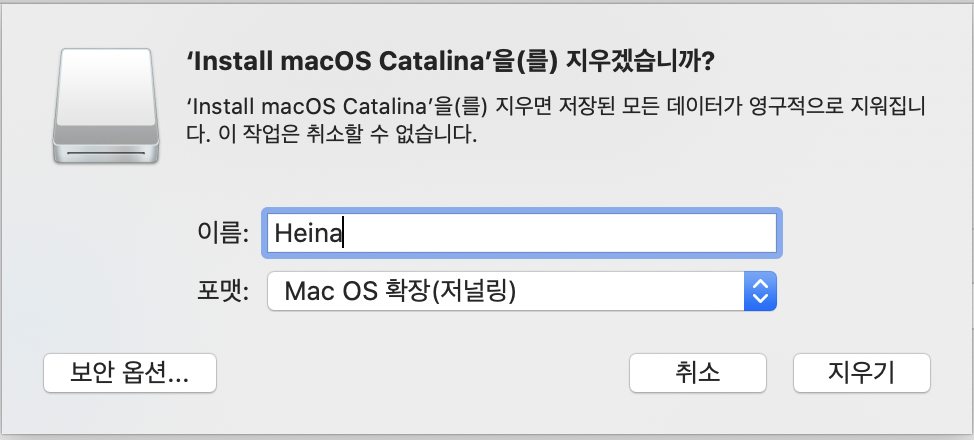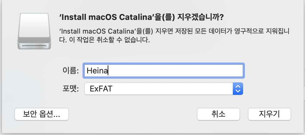 USB를 지우는 것을 다시 한번 확인하는 알림창이 뜬다. USB의 이름과 여러 포맷들을 선택할 수 있다.