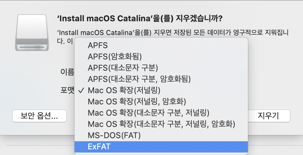 맥북에서는 여러가지 포맷을 제공하고 있는데 선택할 수 있는 포맷들은 아래와 같다. 나는 윈도우와 맥에서 동시에 사용할 예정이기 때문에 ExFAT을 선택했다.