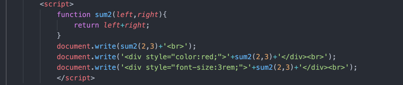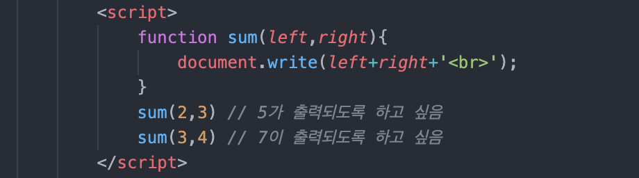위와 같이 코드를 작성하면 결과값으로 의도한 5, 7을 각각 얻을 수 있다. 여기에서 함수이름인 sum 옆의 괄호()안에 있는 left, right를 매개변수(parameter)라고 한다. 그리고 함수가 호출될 때 함수로 값을 전달해주는 2와 3, 3과 4를 인자(argument)라고 한다.